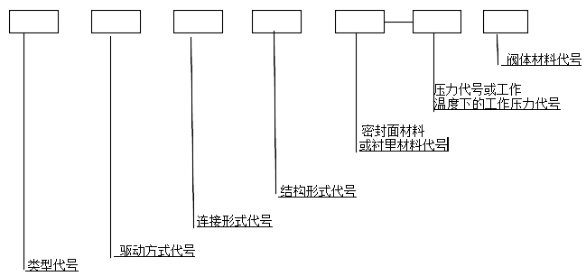 1. 閥門型號由閥門類型、驅(qū)動方式、連接形式、結(jié)構(gòu)形式、密封面材料或里襯材料類型、壓力代號或 工作溫度下的工作壓力、閥體材料七部分組成。